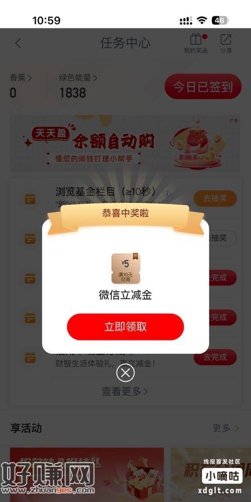 工行任务中心,xing/用卡账单分期,分期100,分1期,手续费0.96,目前5元