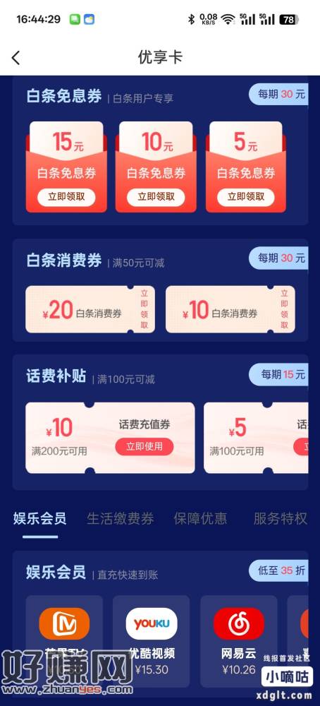 发个毛 翼支付APP底部→借贷→全部频道→优享卡 3元,开了取消续费,领权益就行,200-10元电费券,200-10 100-5元话费券