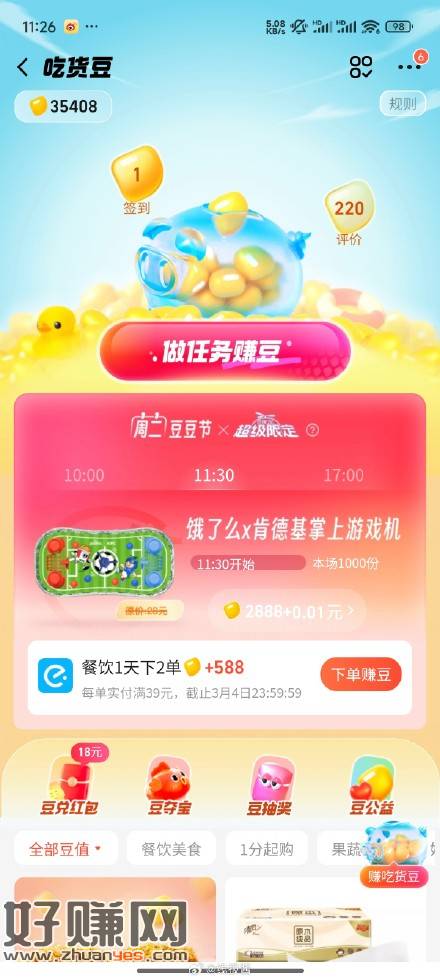 饿了么吃货豆,11:30,17点有游戏机兑换