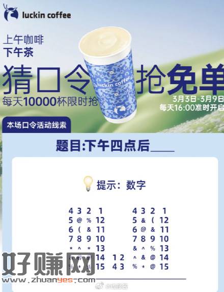 瑞幸7万杯免单,每日16点猜口令赢免单,截止3.9