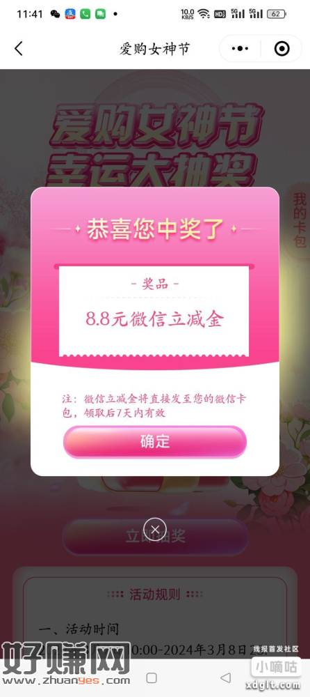 工行E生活微信小程序,底下点爱购女神节,抽奖,中了8.8
