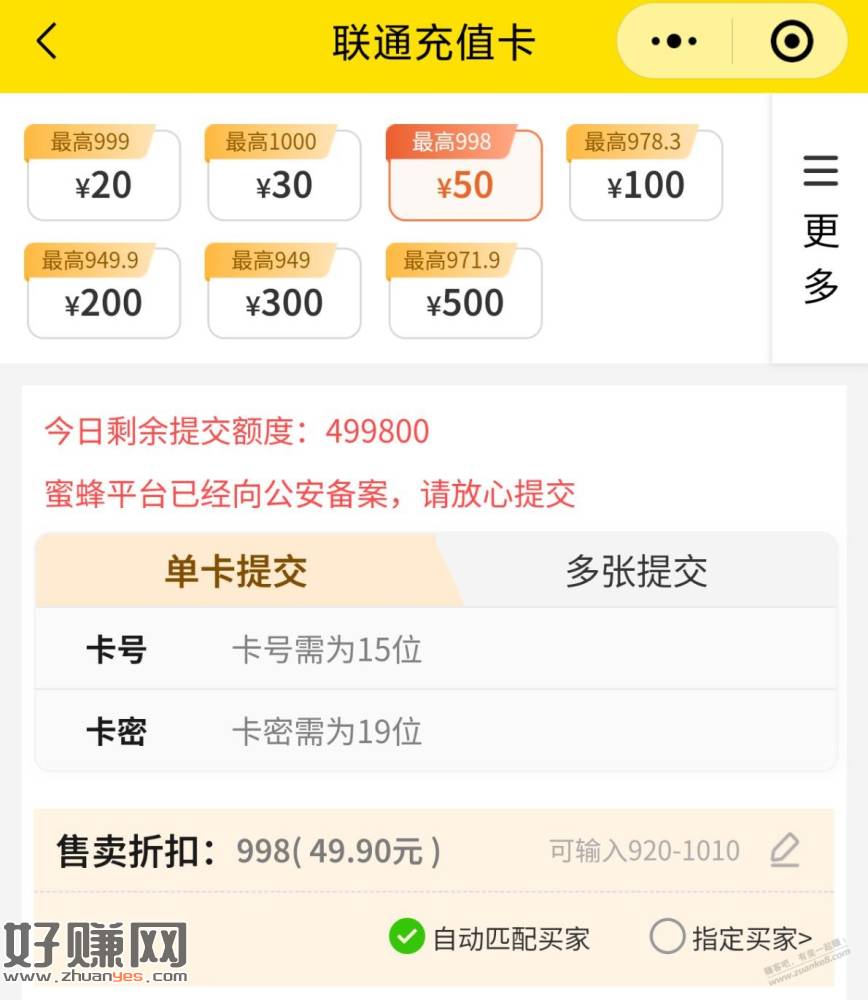 联通app,搜索充值卡,买2张50的联通充值卡,付款有建行优惠(-6),有两次优惠。可以去“蜜蜂收卡”gzh出,49.9一张收