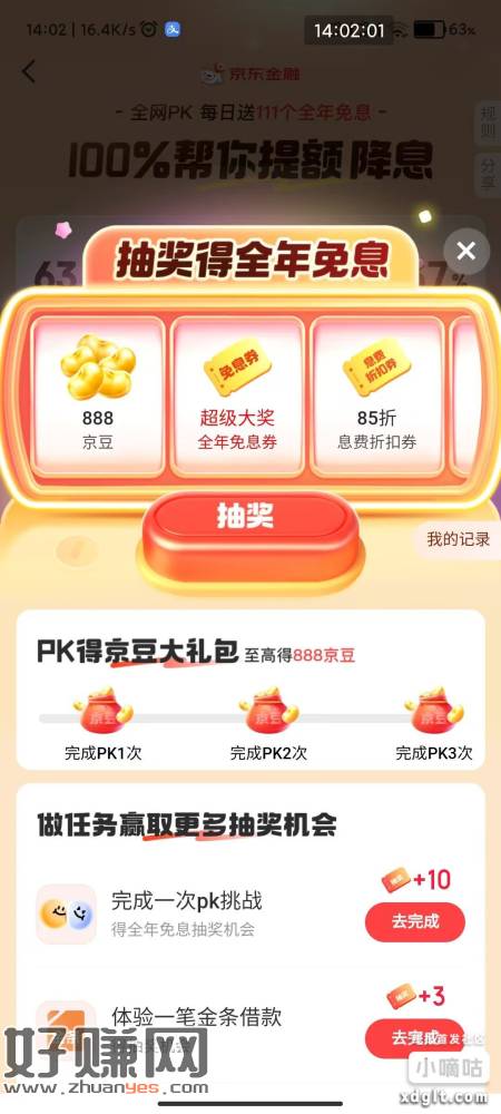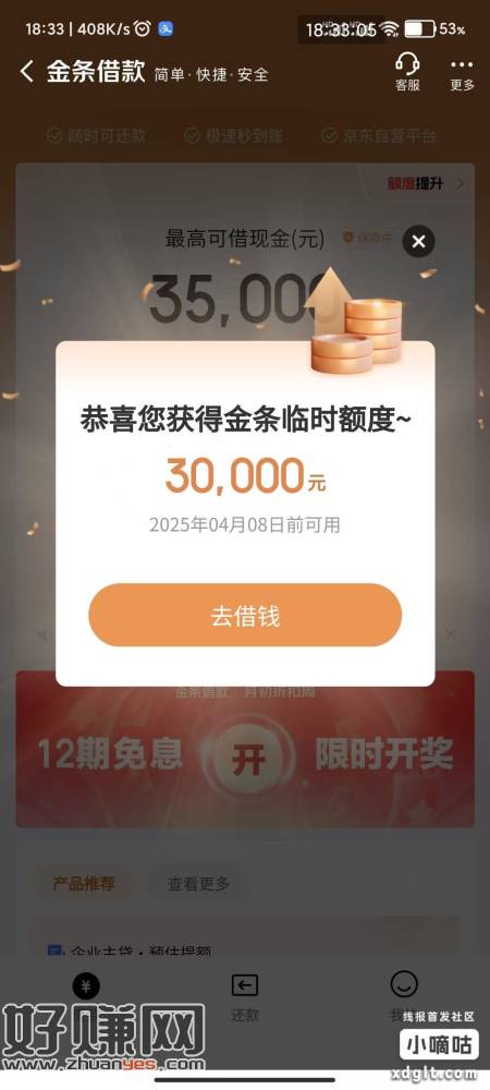 表妹支援——看京东里面有没有给你们提额?京东金融里面刚给我提了35000的额度。 后首页点击进去金条借款 然后页面下面会有一个横幅,点击进去,然后进行抽奖,抽那个免息券。 抽中年免息的话就是妥妥500+大毛。放到小金库里面一年就500多利息。我抽中了一个星期的。免息