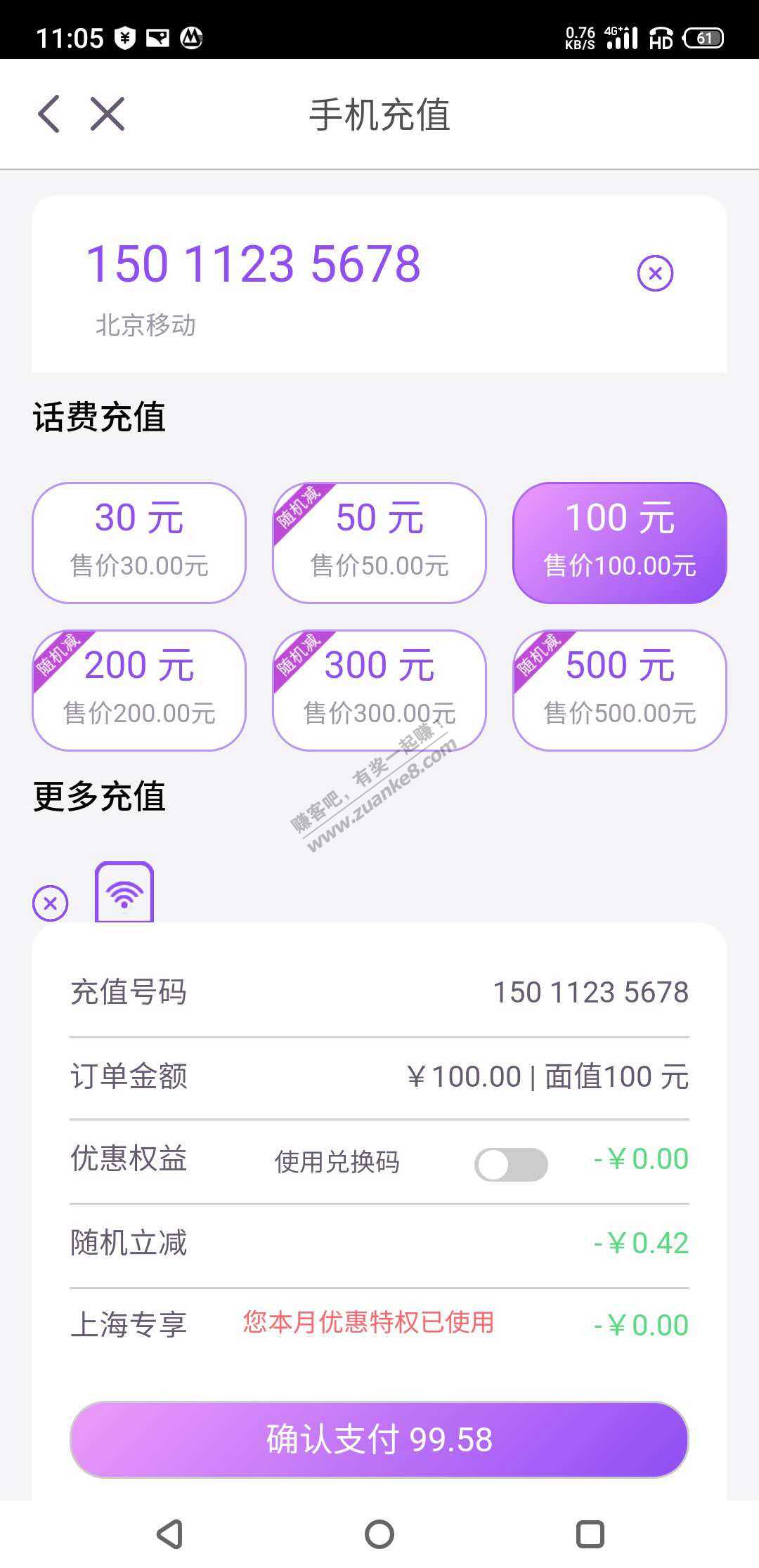 定位上海,话费选择充值100,可以看到活的满减多少,我的是九折,合适就付款,充江苏移动买e卡都是不错的选择