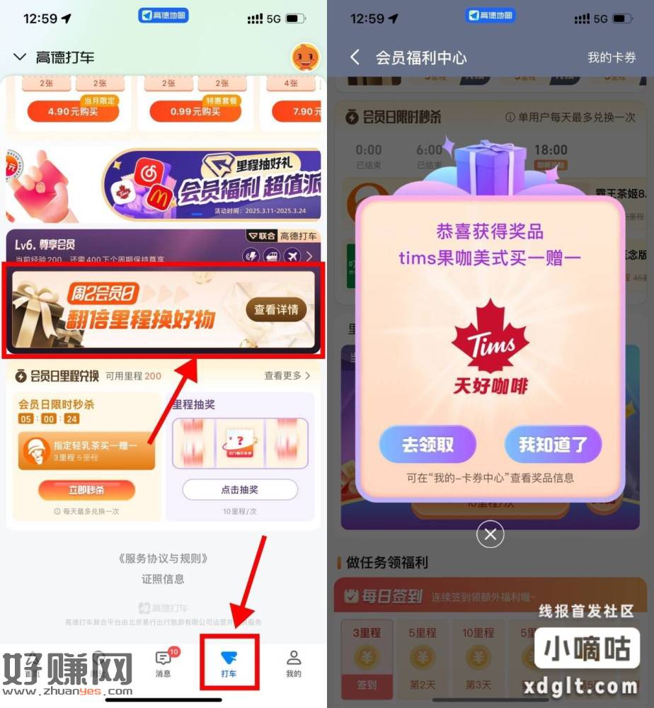 【高德地图里程抽奶茶券或会员】高德地图APP底部“打车”->下拉“周2会员日”->每10里程抽Tims买一送一券 或 网易云音乐月卡->还能用3里程兑换沪上阿姨买一送一券