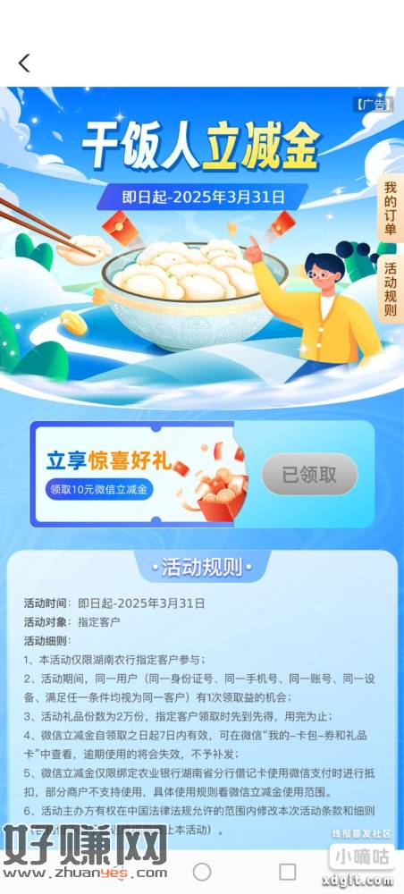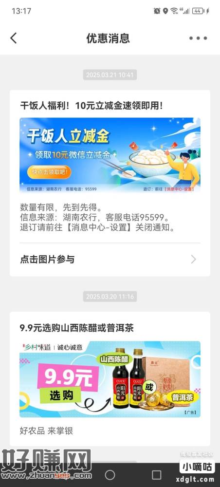 农行湖南,点击消息,优惠消息,有干饭人福利10立减金,两万份