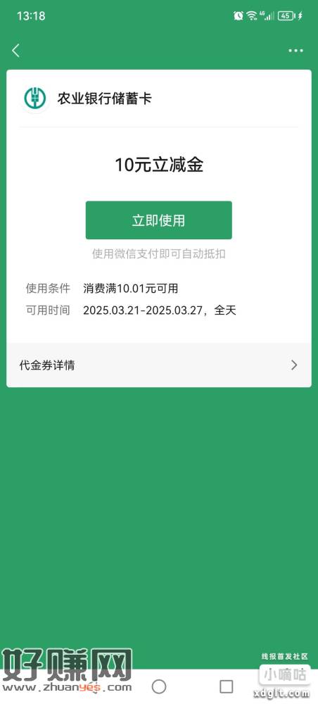 农行湖南,点击消息,优惠消息,有干饭人福利10立减金,两万份,先到先得。
