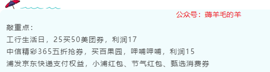 7月22号周三,银行活动,工行生活日买美团利润17;中信精彩365买百果园呷哺呷哺利15