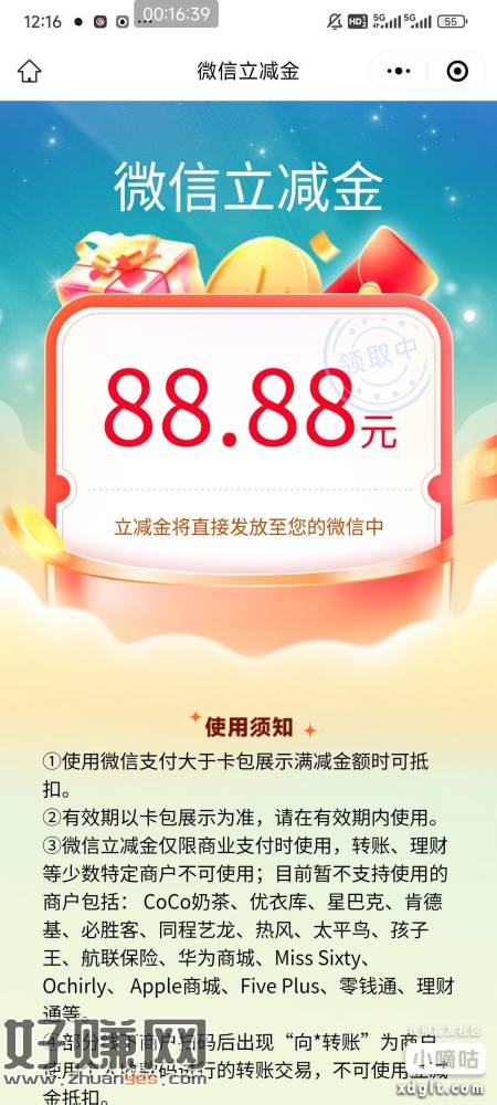 建行抽最高88.88元微信立减金