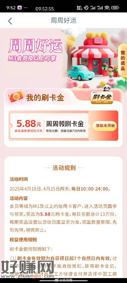 10点,工银e生活m3以上搜周周好运,可领50-5.88刷卡金