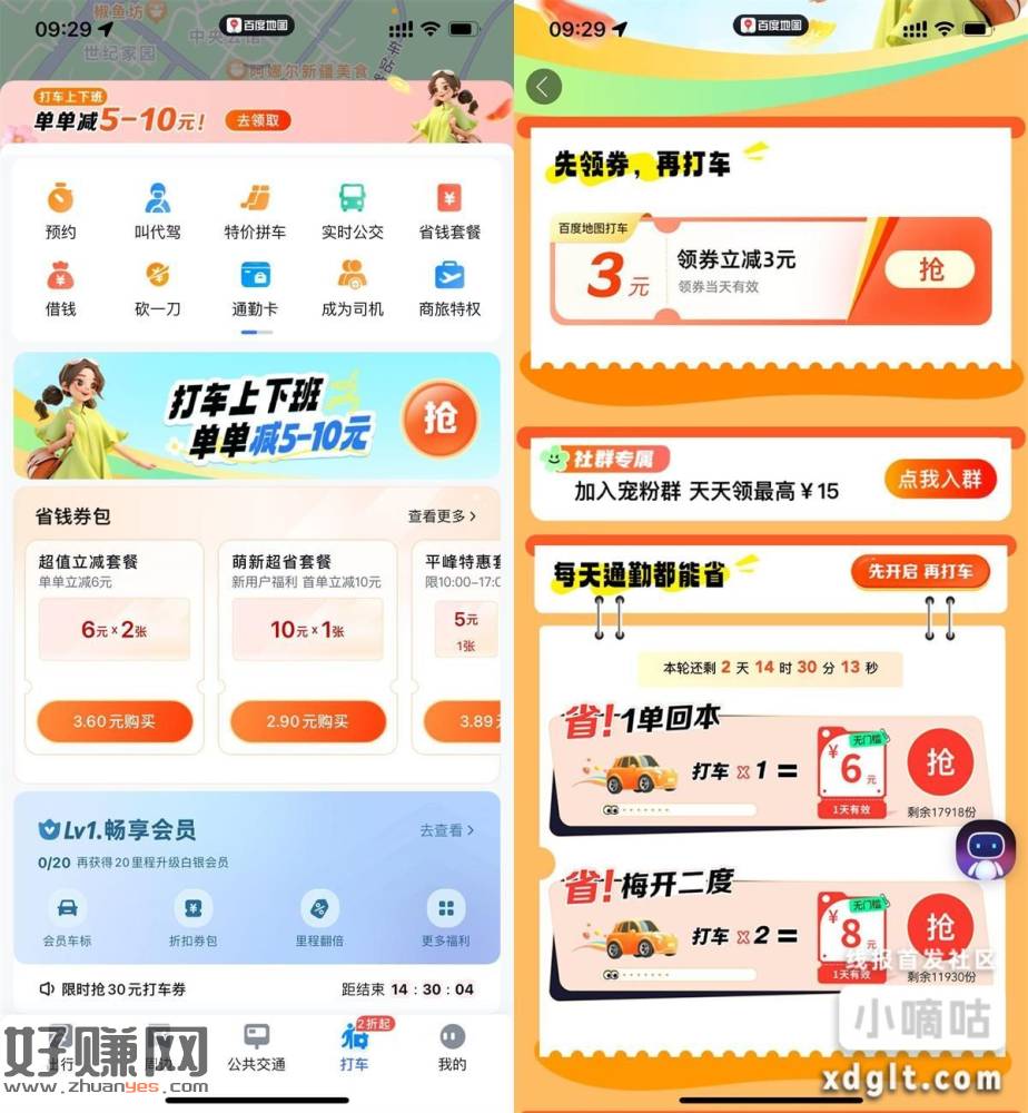 百度地图APP底部“打车”->点击横幅进入->先去开启一下活动->打车1/2次分别领5/7亓打车券