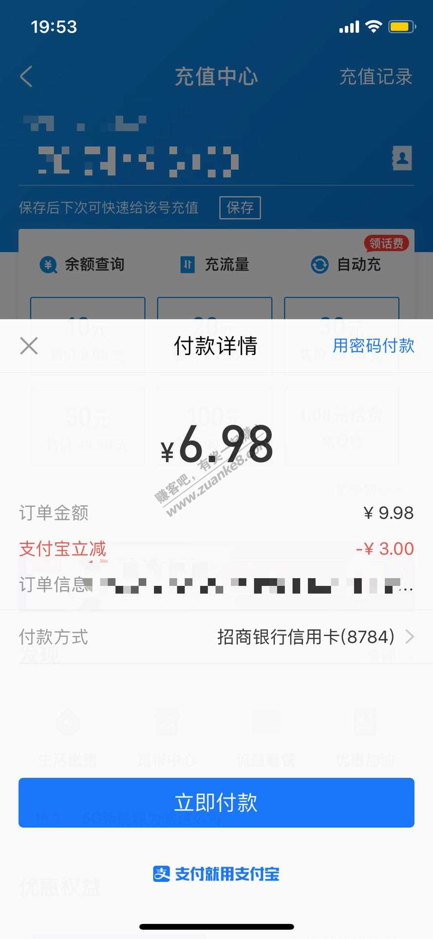 支付宝-话费充值-充10元,选择招行xing/用卡支付,立减3元,可以出平台