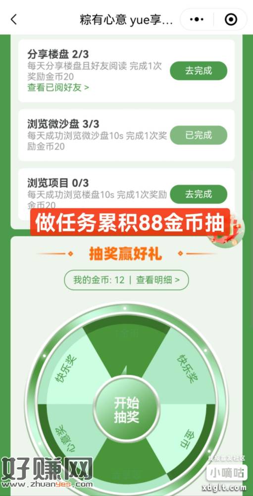 《越秀房宝》小程序进去弹窗,做任务满88金币抽