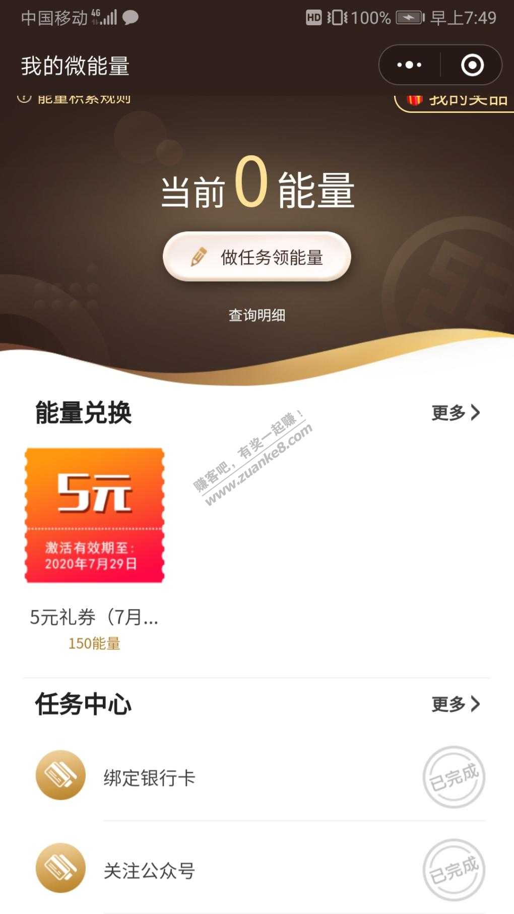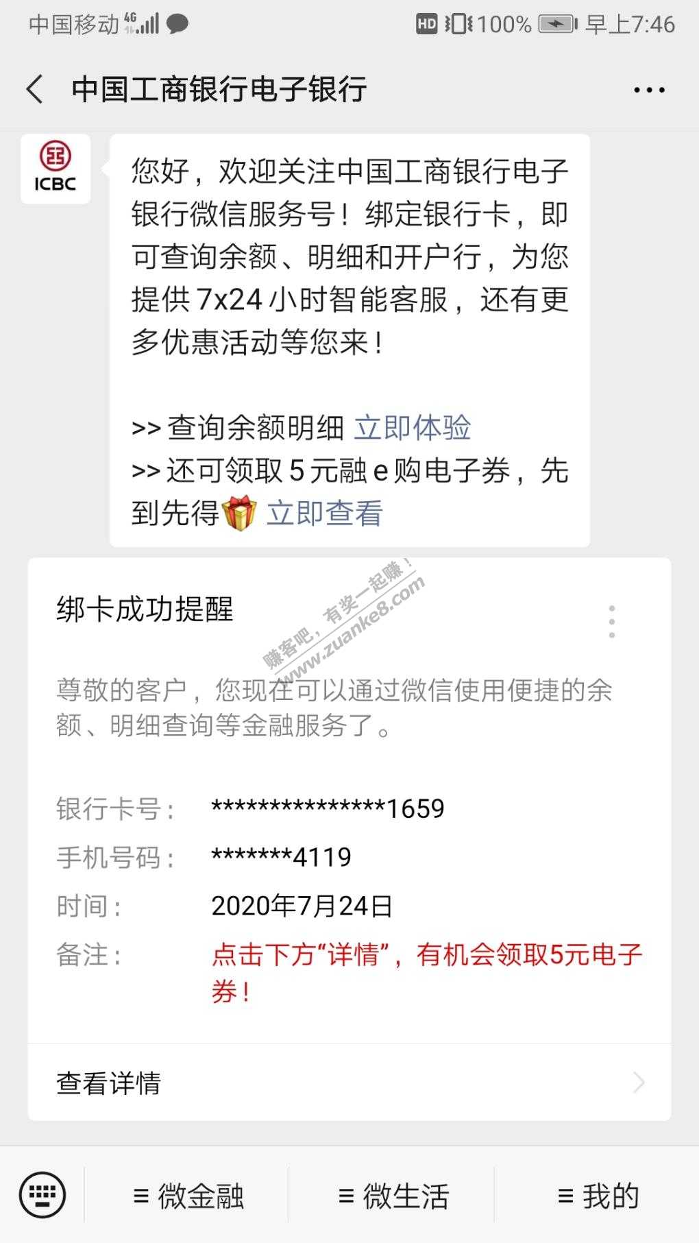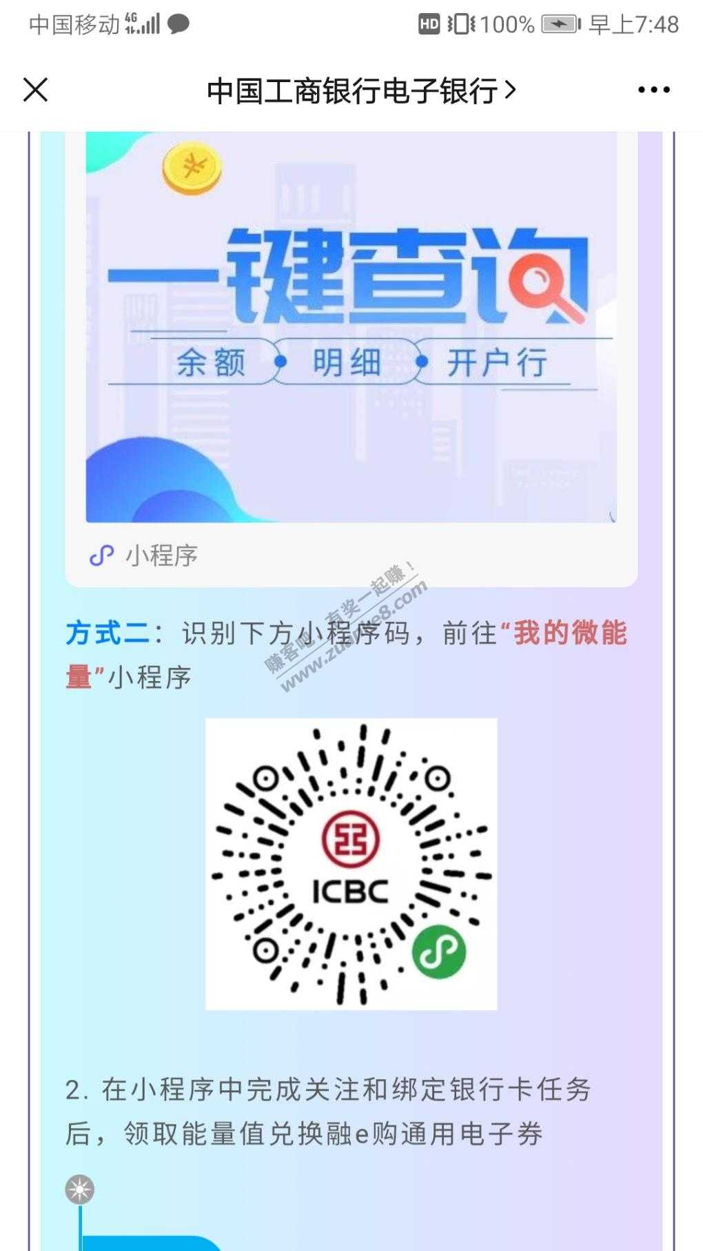 微信公众号关注中国工商银行电子银行,扫码识别我的微能量,绑定工行卡免费兑换5元融E购电子券