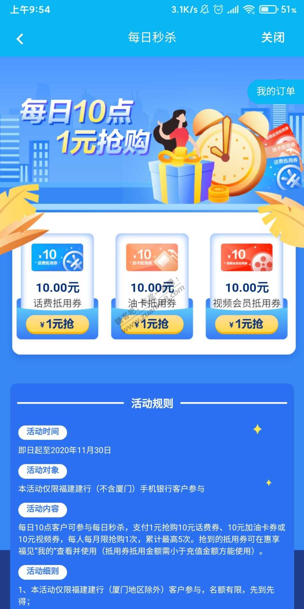 建行app-悦享生活定位福建-惠享福见-每日秒杀。每天10点,每月一次到11月。抢1元买10元券,然后惠享福建页面充话费,19充20话费可抵扣。