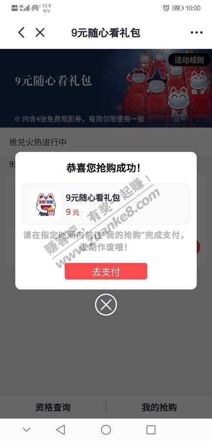 每天10点开始抢,9块钱买4张电影票,1周可以用一张。
