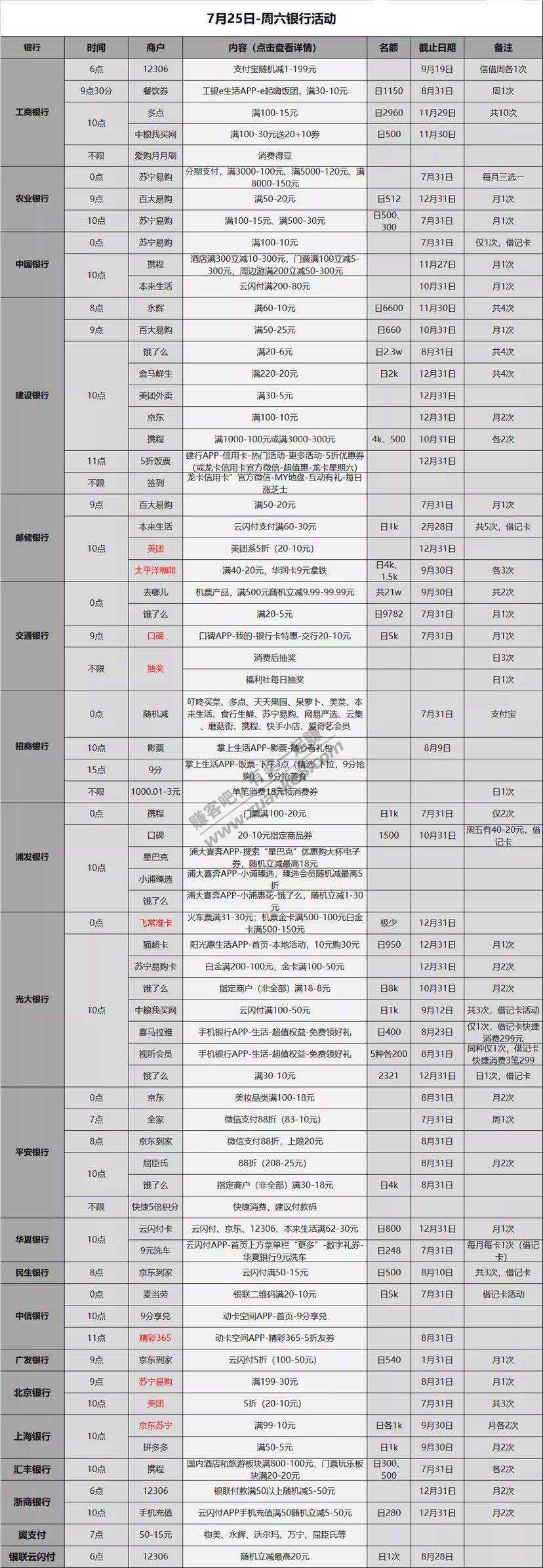 7.25各大银行薅羊毛活动