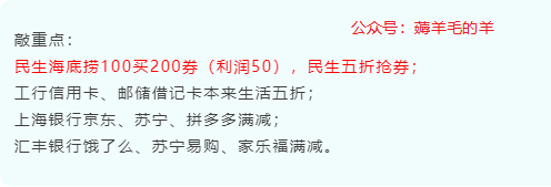 敲重点:民生海底捞100买200券(利润50),民生五折抢券;工行xing/用卡、邮储借记卡本来生活五折;上海银行京东、苏宁、拼多多满减;汇丰银行饿了么、苏宁易购、家乐福满减。0点开始活动农行-苏宁分期:每日,苏宁易购购买实物,农行xing/用卡分期支付、满3000-100元(月1000名额)、满5000-120元(月600名额)(月1次,三选一,7月31日截止)交行-饿了么:每日,饿了么使用支付宝绑卡支付,满20-5元(9782名额,月1次,7月31日截止)交行-去哪儿:每日,去哪儿旅行APP使用交行xing/用卡支付订购机票产品,满500元随机立减9.99-99.99元(共21w个名额,共2次,9月30日截止)浦发(借)-微信支付:每日,在指定商户通过微信绑卡支付,可享满减优惠孩子王门店/APP/小程序,满300减50元鲜丰水果门店,满50减20元苏果超市门店,满50减10元好孩子云店/星站云店/mothercare小程序,满100减30元食行生鲜APP/小程序,满100减30元(周各限1次,每日名额有限(7月31日截止)浦发-携程门票:每日,携程APP-首页-更多-合作卡-浦发xing/用卡,购买景点门票使用浦发xing/用卡支付,满100-20元(每日1k名额,限2次,7月31日截止)中信-精彩365:每日,动卡空间APP-友鱼-精彩365,可7折起抢购:盒马鲜生、奈雪、周黑鸭、美团外卖、必胜客、滴滴、达美乐、肯德基、百果园等代金券(8月31日截止)中信(借)-麦当劳:每日,麦当劳指定门店使用银联二维码选择中信借记卡支付,满20-10元(每日5k个名额,7月31日截止)平安-京东:每日,京东购买美妆品类使用平安xing/用卡支付,满100-18元(日1次,月2次,8月31日截止)平安-喜茶:每日,喜茶门店/微信小程序,使用微信绑卡消费,满50减18元(日3K名额,日1次、月2次,9月30日截止)银联云闪付-小米有品:每日,小米有品APP购物使用云闪付APP支付,满100-15元(共6W名额,月1次,7月31日截止)墨迹天气-微信“墨迹天气”小程序-点击领雪碧,每天都可以免费领取中杯汽水电子兑换码一张,可至麦当劳门店扫码兑换使用单日单用户限使用一张,(9月4日截止)京东-PLUS会员支付券:每日抢:36元小金库消费券包(18元支付券+18元还款券),活动入口:本公众号回复“京东支付”即可获取(月1次,8月31日截止)6点开始活动工行-一二306:每日,一二306APP或支付宝APP“火车票机票”频道等渠道购买或候补,选择支付宝支付,享1至199元随机立减(每周xing/用卡、储蓄卡各1次,9月19日截止)银联云闪付-一二306:一二306APP购票,云闪付绑卡支付,享最高20元随机立减(2k名额,日1次,8月28日截止)浙商银行-一二306:一二306APP购票选银联选择浙商62卡支付,满50随机立减5-50元优惠(月2次,12月31日截止)7点开始活动工行-支付宝:每日,支付宝APP搜“工行送红包”领取话费/缴费红包,满200-10加油红包(名额有限,月各限1次,7月31日截止)浦发(借)-曹操出行:每日,曹操出行APP充值/支付订单使用微信绑卡支付,可享随机立减5-99元,(日限1次,757名额,7月31日截止)平安-全家:每日,全家指定门店使用微信绑卡支付,满1元享88折,10元封顶(周1次,7月31日截止)7点半开始活动建行-饿了么:每日,建设银行APP-悦享生活-饿了么,下单满20-10元(共4次,共72w名额)8点开始活动建行-永辉:每日,永辉生活APP或永辉超市使用支付宝选择建行龙卡xing/用卡支付,满60-10元(每日6600个名额,日1次,共4次,11月30日截止)民生(借)-京东到家:每日,京东到家APP使用云闪付绑卡支付,满50-15元(500名额,日1次,3次,8月10日截止)平安-京东到家:每日,京东到家使用微信支付绑平安xing/用卡支付88折,上限20元(8月31日截止)9点开始活动建行-百大易购:每周六周日,百大易购APP购物使用云闪付绑卡支付,满50-25元,(月限1次,名额有限,10月31日截止)交行-口碑:每日口碑APP-我的-银行卡特惠-交行20-10元,指定商品页面下方可领20-10元优惠券(活动期间限3次,5000名额,7月31日截止)邮储-百大易购:周六周日,百大易购APP购物使用银联支付选择邮储62xing/用卡支付,满50-20元(月1次,7月31日截止)北京银行-苏宁易购:周六周日,苏宁易购使用北京银行xing/用卡支付,满199-30元(月1次,8月31日截止)9点半开始活动工行-喜茶:每周五周六周日喜茶门店/支付宝小程序使用支付宝支付,满50-15元(日1次月4次,1W名额,8月30日截止)工行-e起嗨饭团:每日,工银e生活APP-精选-e起嗨饭团(滚动页),购买指定代金券奈雪/肯德基,满30减10元(周限1次,1150名额,8月31日截止)10点开始活动工行-本来生活:周日,本来生活用工行62xing/用卡支付,满100-50元(日1500个名额,日各1次,7月31日截止)工行-多点:周五周六周日,多点使用工行e支付绑定工行xing/用卡支付,满100-15元(日2960个名额,日1次,共10次,11月29日截止)工行-中粮我买网:周五周六周日,中粮我买网使用工行E支付绑定工行xing/用卡支付,满100-30元)(每日500个名额,日1次,11月30日截止)农行-天天抢券:每日,农业银行xing/用卡微信小程序一慧U惠-精选推荐/农业银行APP-xing/用卡一精品秒杀,7折起抢购指定商户代金券,日限1次、各限2张、活动期间共限6张(7月31日截止)建行-饿了么:每日,饿了么使用支付宝选择建行xing/用卡支付,满20-6元(日2.3w名额,日1次,共4次,8月31日截止)建行-盒马鲜生:每日,盒马鲜生门店或APP使用支付宝选择建行xing/用卡支付,满220-20元(日2k名额,日1次,共4次,12月31日截止)邮储(借)-本来生活:周六周日,本来生活APP购物使用云闪付选择邮储借记卡支付,满60-30元(每日1k个名额,共5次,2021年2月28日截止)招行-影票:每日,掌上生活APP-影票-随心看礼包,9元购4张影票(8月9日截止)光大-天猫超市:每日,阳光惠生活AP