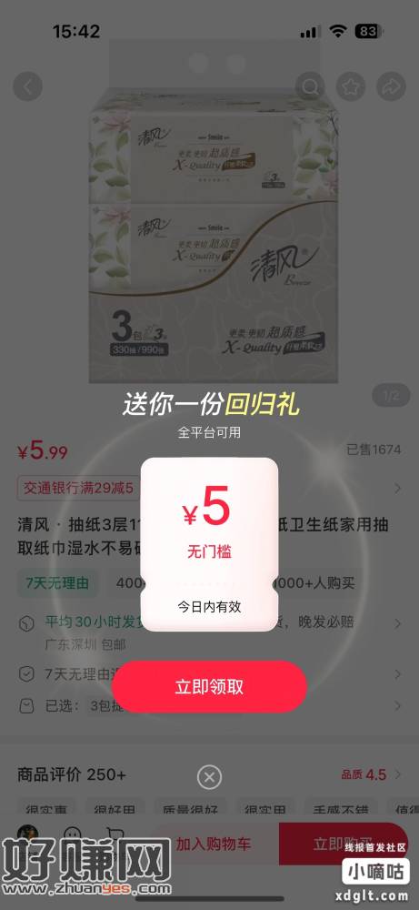 小红书市集随便点击一个商品,有回归礼,无门槛5元