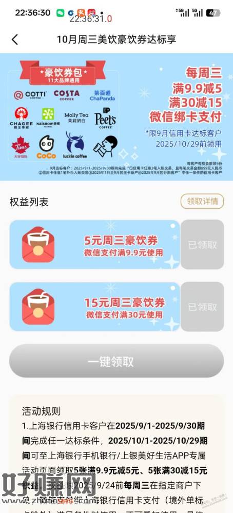 上海银行app,xing/用卡,周三豪饮券,9.9-5,30-15