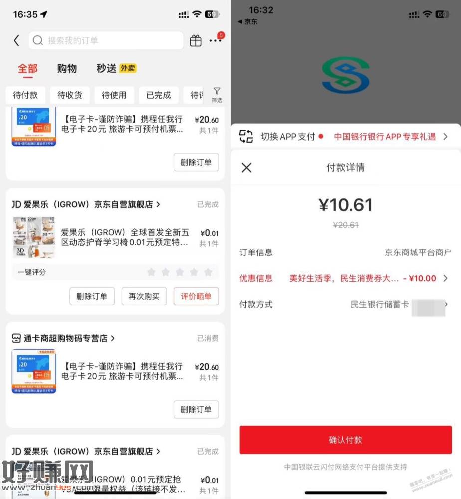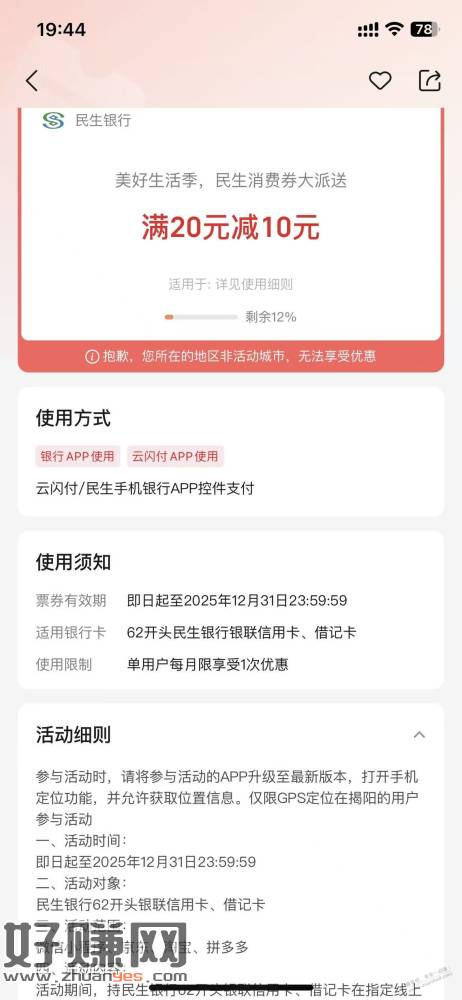 首先,把云闪付app账号退出,jd买携程20电子卡+0.01特权,虚拟飞到广东揭阳,付款选云闪付…再跳到民生银行app就会看到20减10的优惠=2次