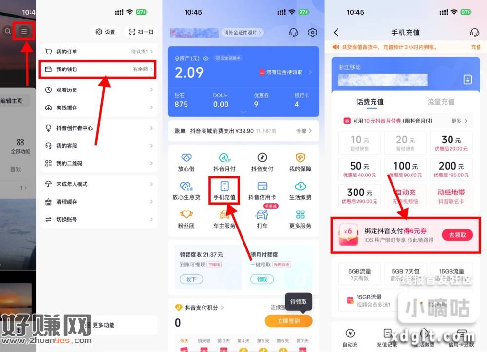 抖音APP底部“我的”->右上角点开“我的钱包”->手机充値->苹果用户可领6亓支付券