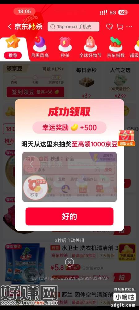 京东app,我的-京豆-右上角立即签到,进入页面后会弹出一个窗口说触发抽奖,然后点一下抽奖,大概率中500豆子,然后自动跳转首页,进入秒杀页面领取