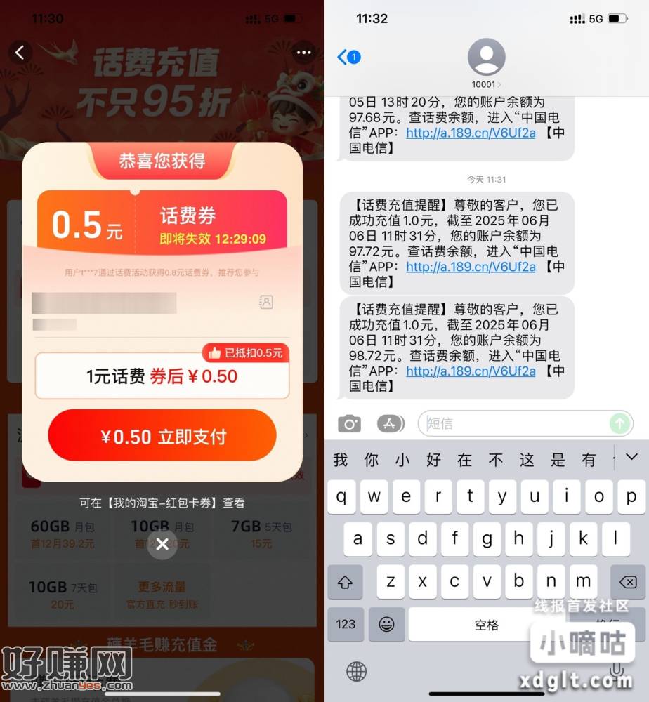 淘宝APP扫码->弹3个0.5亓话费券,联通和电信用户可0.5亓冲1亓话费
