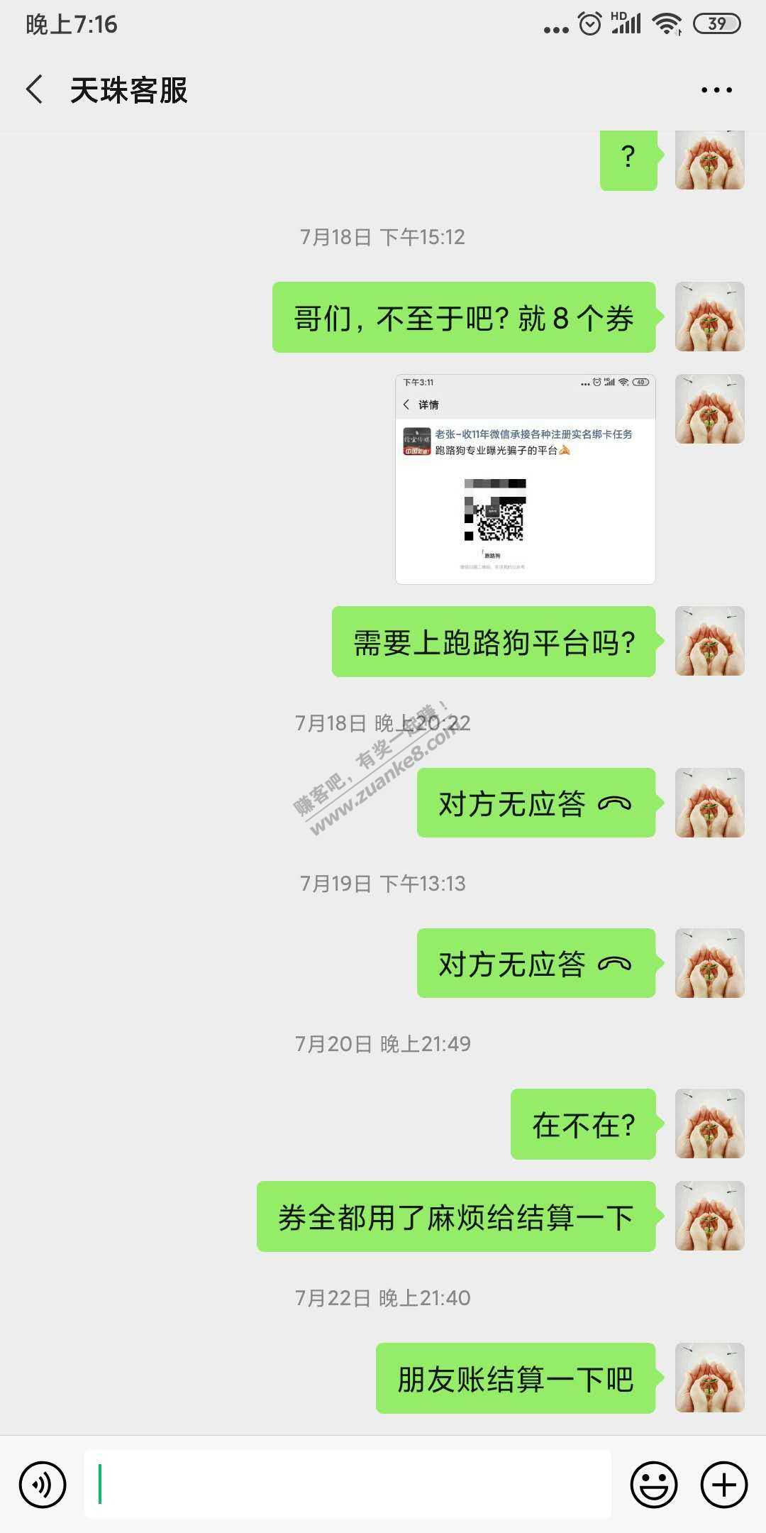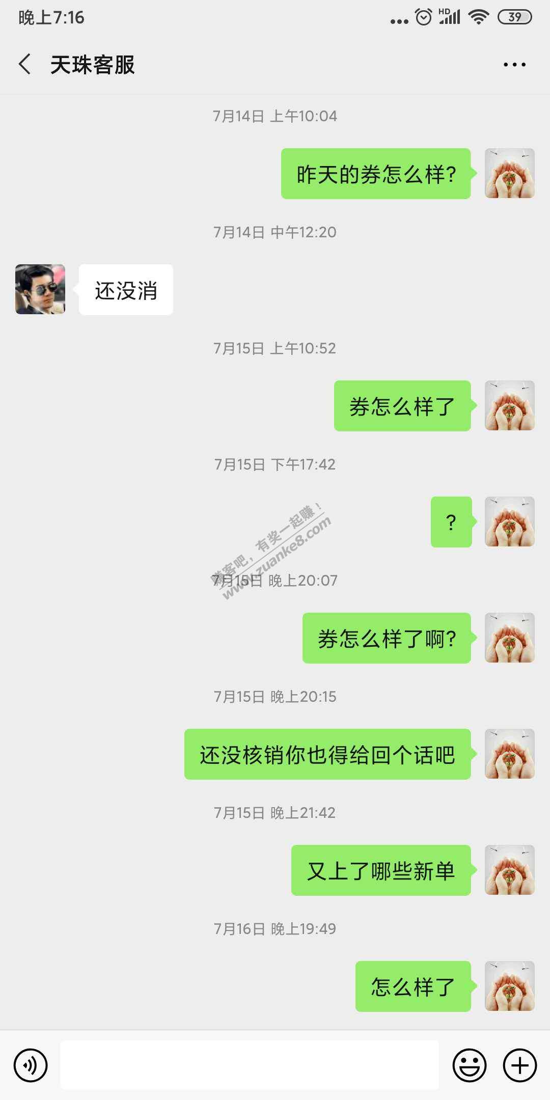 他收券,我加了他一个多月想跟他合作一下,发了8个券给他,每个是17块多