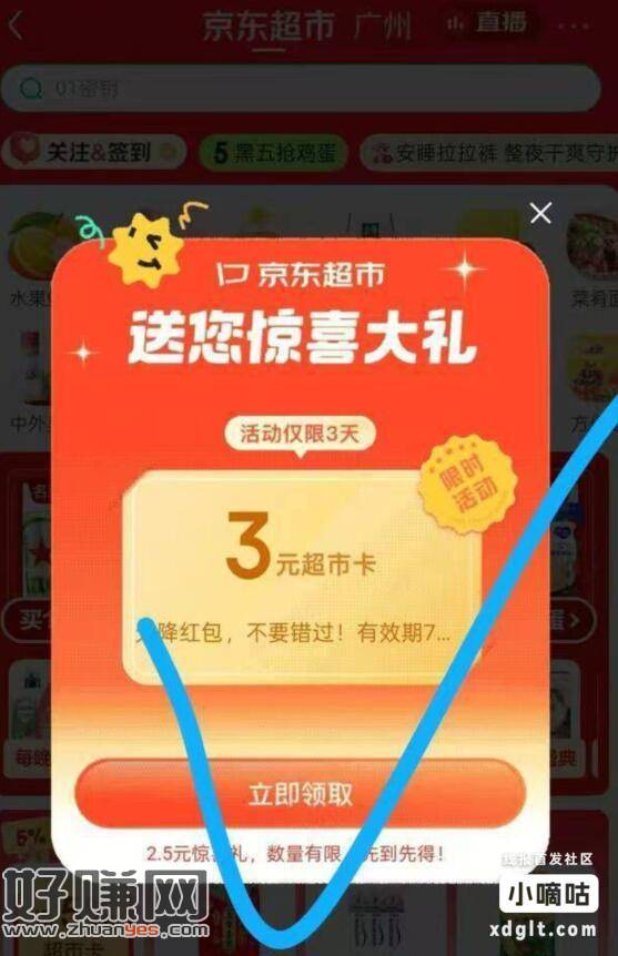 京东app-京东超市进去,部分人弹窗3超市卡,简单做任务就能
