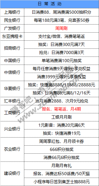 每月消费满1888元/5888元/8888元,可于次月10日10点在相应消费专区使用积分兑换:指定商品(油卡/实物礼品),名额有限活动入口:建行积分商城搜索“4月”等关键字搜索,油卡较为划算,每种仅1份(12月31日截止)