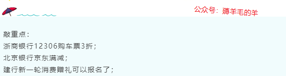 7月30号周四,银行活动,浙商银行一二306购车票3折;北京银行京东满减;
