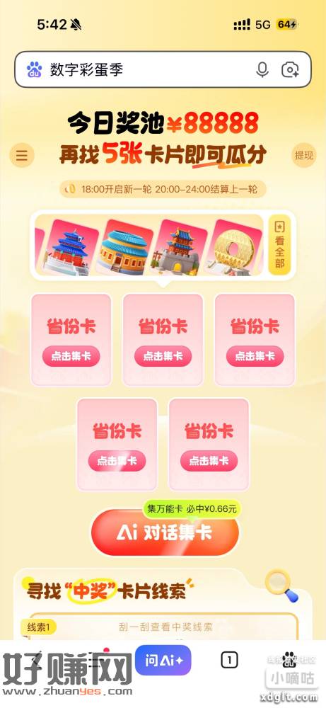 暑期AI拍照集咔彩蛋活动来袭,通过拍照/问AI集咔,每天可以瓜分88888亓奖jin,奖jin根据集咔的正确数量递增,正确数量越多,奖jin越高,单人每场最高可得百亓 线索:福建、江苏、贵州、台湾、必中一张