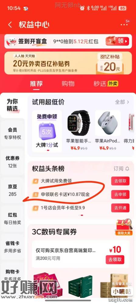 京东app 搜权益中心 看图 申请xyk给10块钱 然后乱