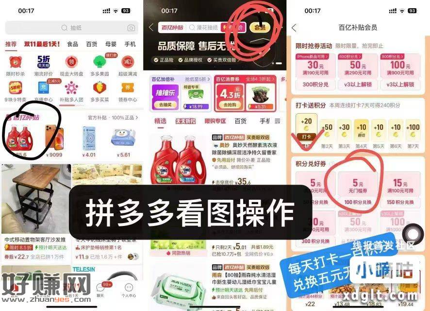 拼夕夕5教程,每天去打卡,够一百积分兑换五无门槛