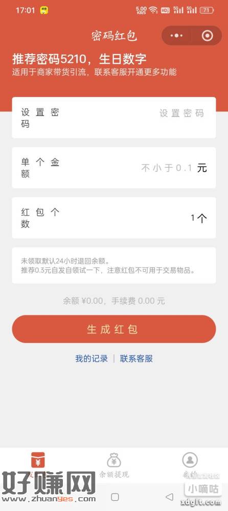 密码红包微信小程序,发5元红包,云闪付付款-1,提现手续费0.1