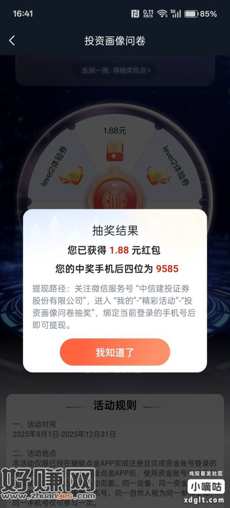 蜻蜓点金里的完成投资画像问卷抽奖,刚中1.88