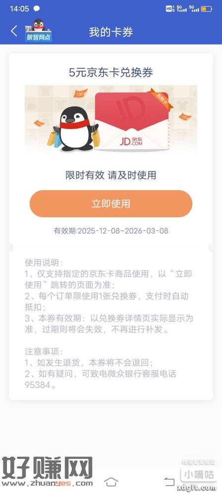 昨晚微众银行领取了10-5三张优惠券,用他行卡入金微众银行买入10,首次有5元京东e卡,用银行卡绑定的微信登录,在权益,点卡券,5元优惠券买e卡