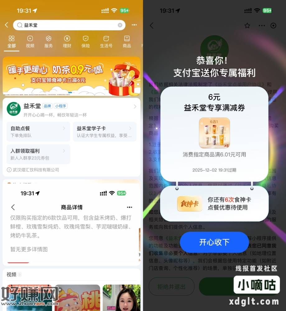 【支付宝领取6亓券几毛喝奶茶】支付宝分别搜索“益禾堂、沪上阿姨、奈雪的茶、古茗”->点横幅进入自动弹6亓券,支付时才可看见抵扣