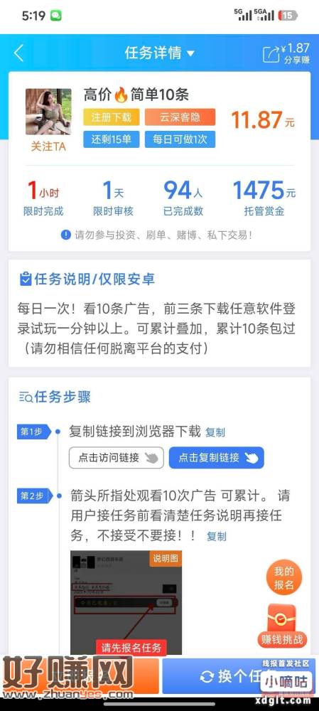 那种任务平台有很多那种看10个广告的任务基本到手11-12元。这个不吃权重,1元提现秒到账