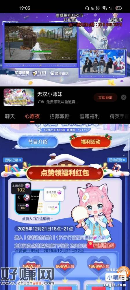 斗鱼30分红包雨 花老湿直播间 聊天页面 底部会自动弹