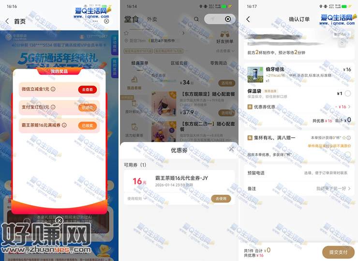 想参与的可以参与试试看哦,亲测1元立减金+1元支付宝红包+霸王茶姬16元代金券