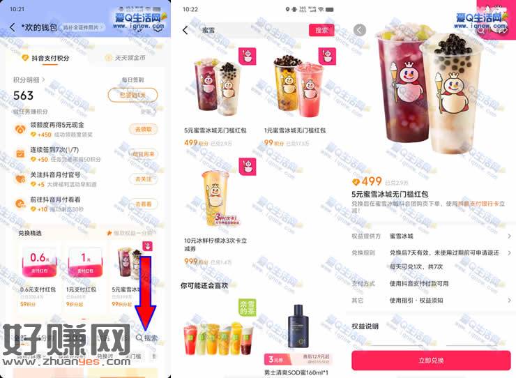 抖音APP-我的-我的钱包-下拉积分处-下拉搜索【蜜雪冰城】,499积分兑换5元无门槛