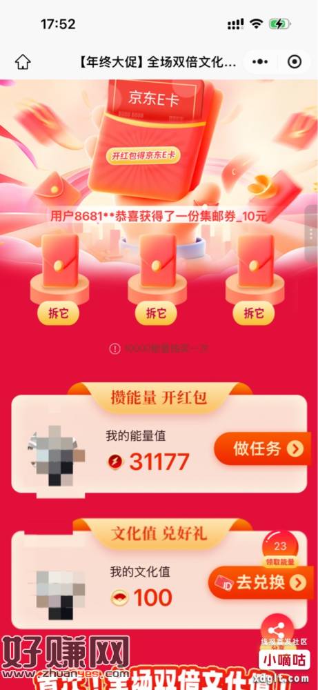 抽e咔,能量值都是浏览任务,分享好友的那个直接转发5次给小号就行,文化值高的也可以兑换e咔
