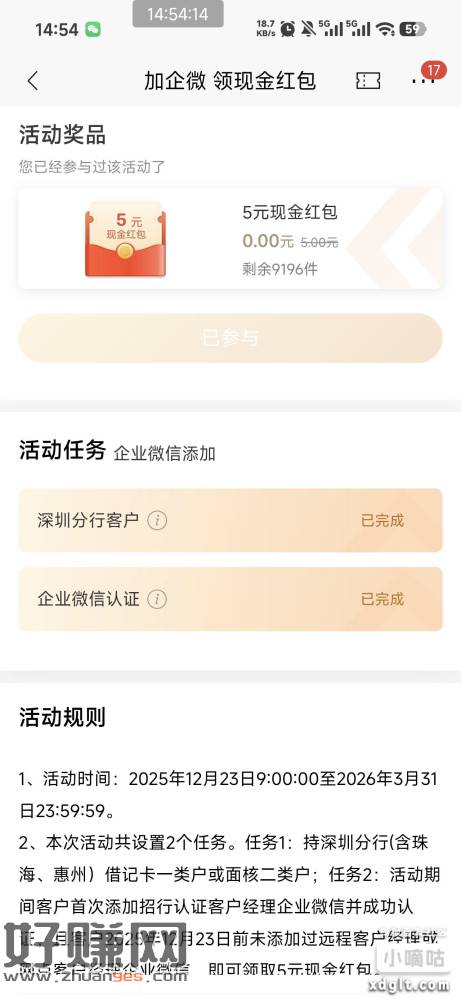 招商银行(深圳 珠海 惠州)城市 新户专区,加企微有5元现金红包,用没加过招商的微信去加就能完成