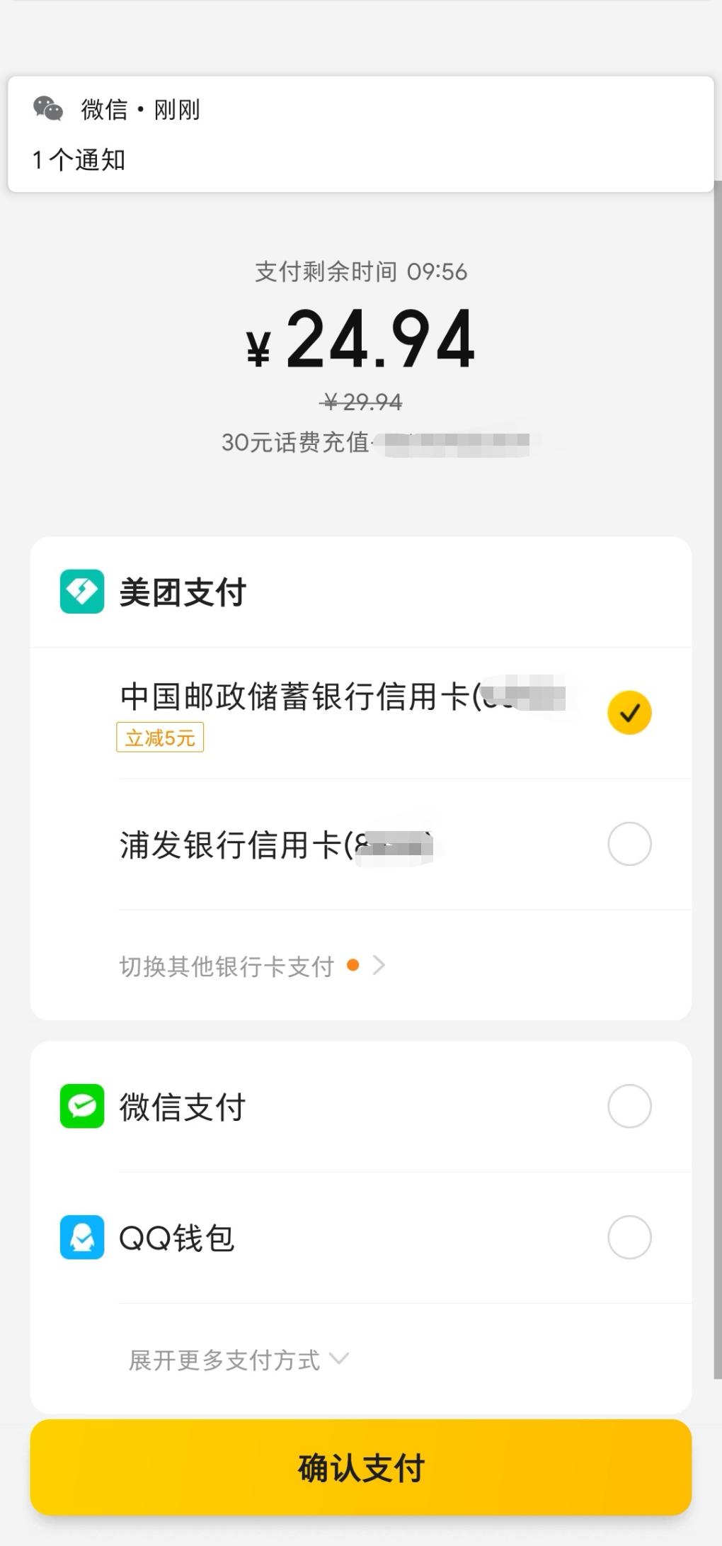 美团邮储xing/用卡充话费,满30减5(2次)