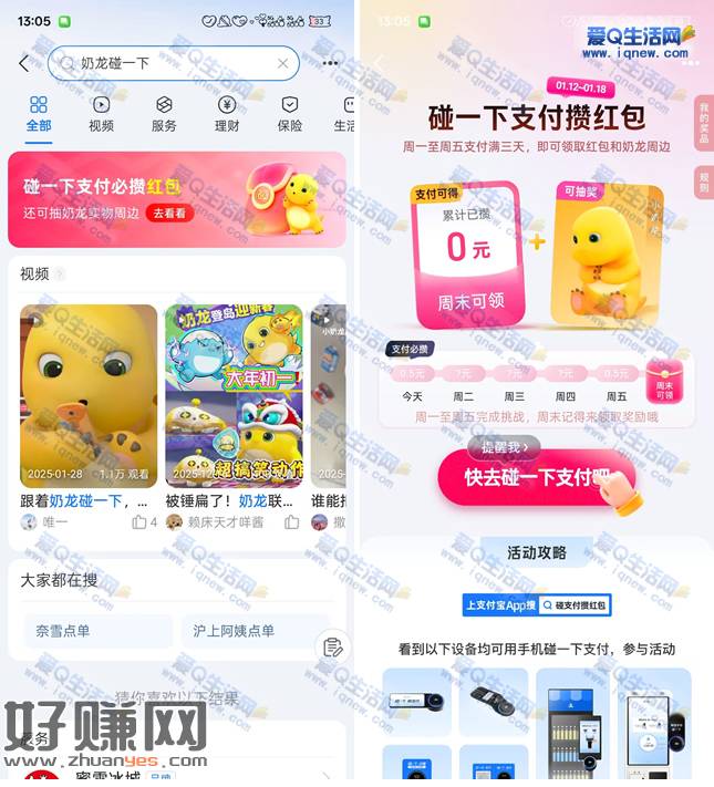 支付宝碰一下支付攒红包 领红包+抽小奶龙周边