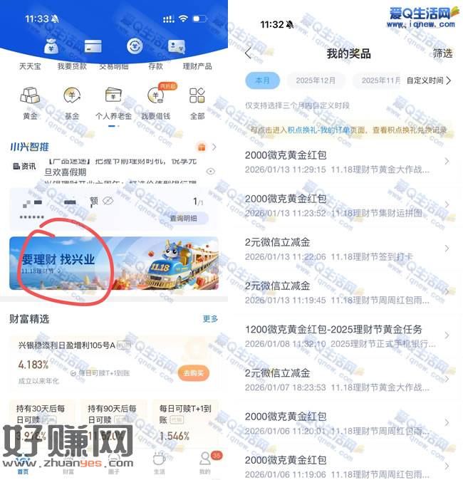 兴业银行APP-首页-下拉至【要理财 找兴业】点进去 完成所有活动 获得黄金红包+现金红包 合计8元左右