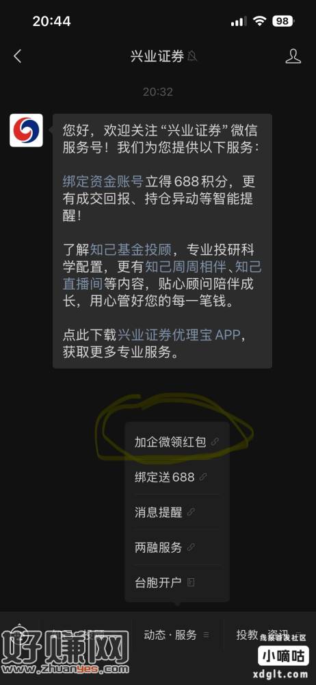 第二步去兴业证券服务号点菜单栏中间第一个领红包 秒推