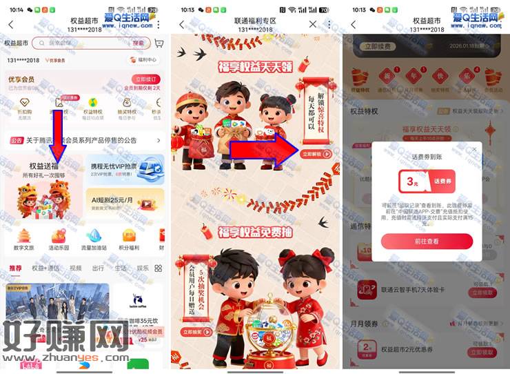 联通APP-搜【权益超市】-下拉滚动窗口【权益送福】-下拉右侧【立即解锁】-解锁领会员-下拉抽1-10元话费券
